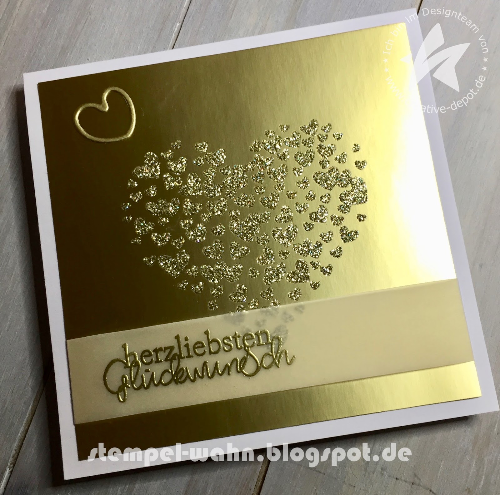 Verwendet habe ich diese Schablone von creative-depot (Werbung) mit Cosmic Shimmer (Sparkle Texture Paste in "New Gold", ein Träumchen 😊). Den Text habe ich embosst und er ist aus dem schönen Set "Geschwungene Grüße - Modern", die Stanze für das kleine Herz oben links findest Du *hier* (alles von creative-depot - noch mehr Werbung ;)).